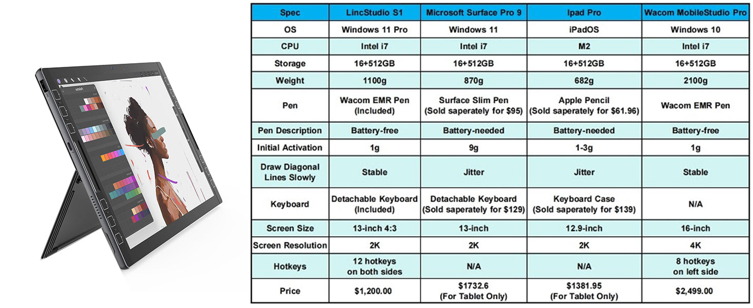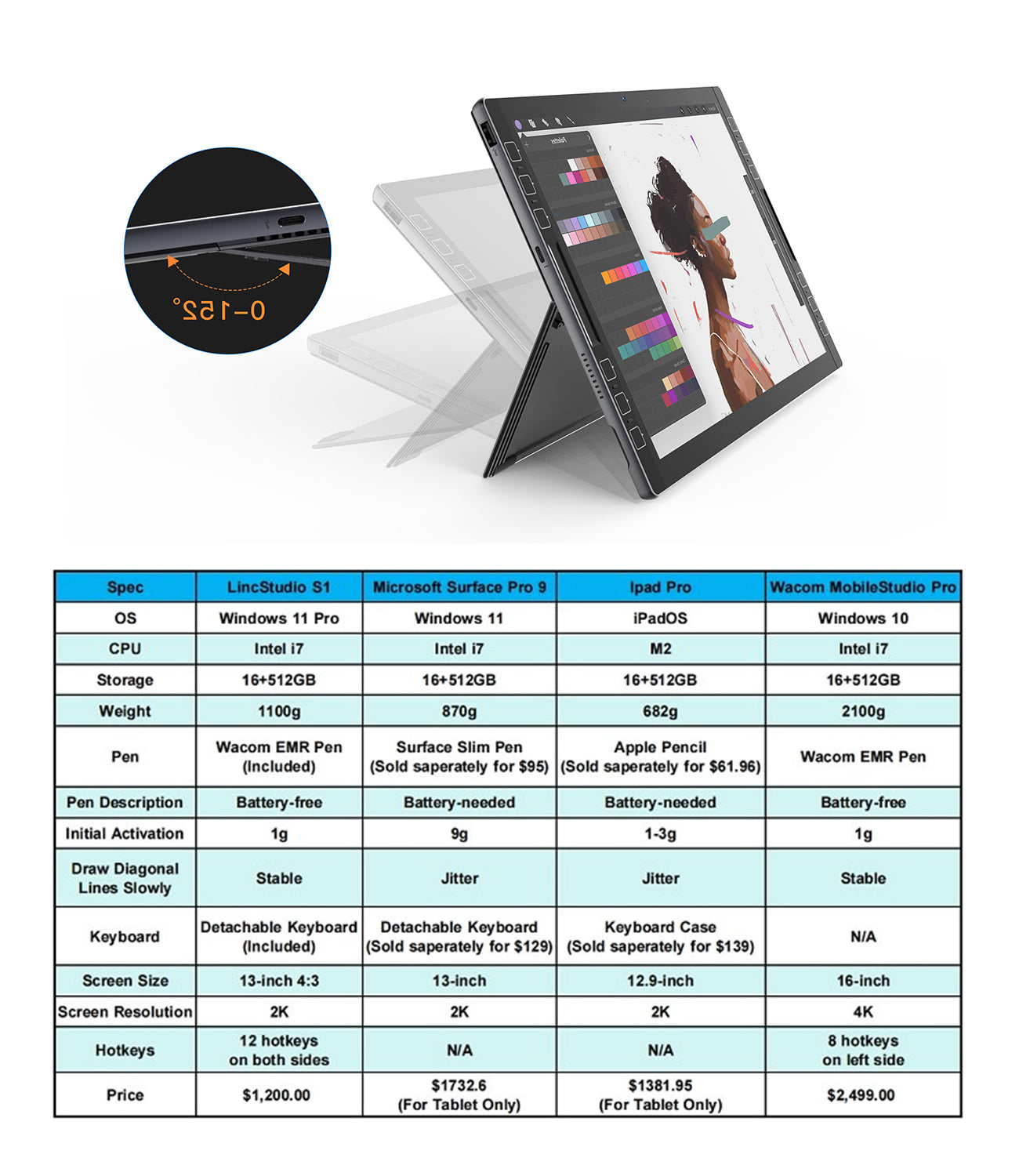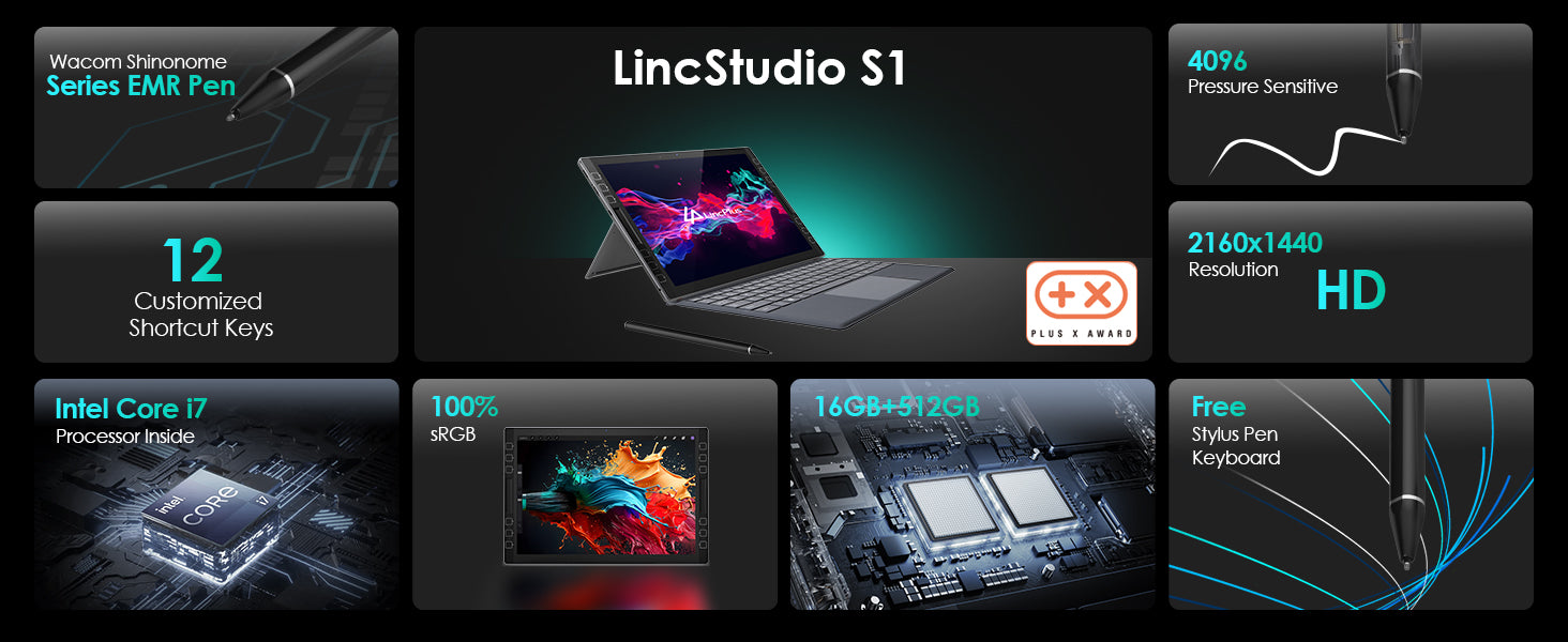 The LincStudio is an all-in-one creator tablet. It comes with an Intel Core i7 processor, Windows 11 OS, a Wacom EMR pen, a 2K display, 12 custom shortcut keys, a detachable keyboard, and a built-in stand.