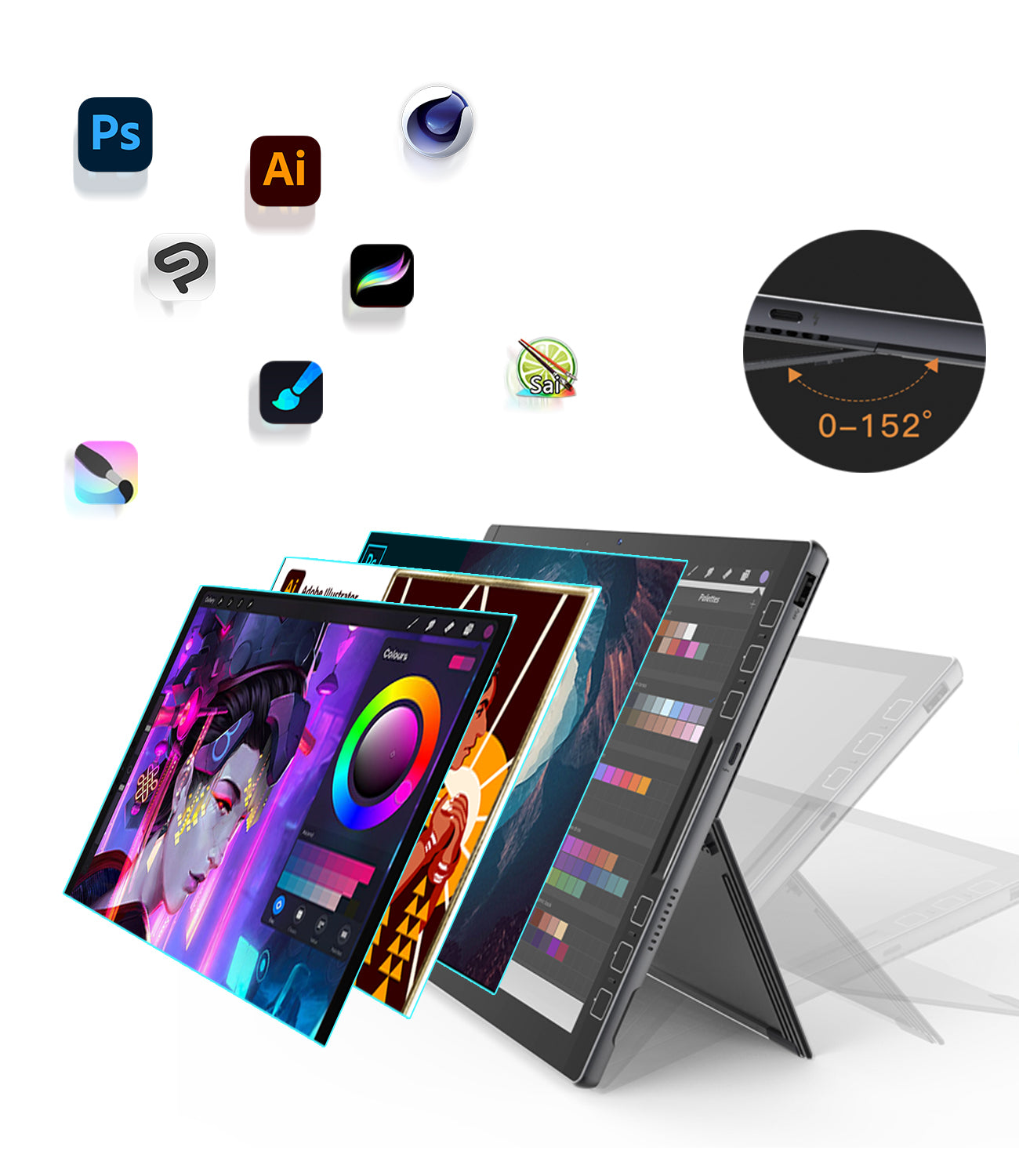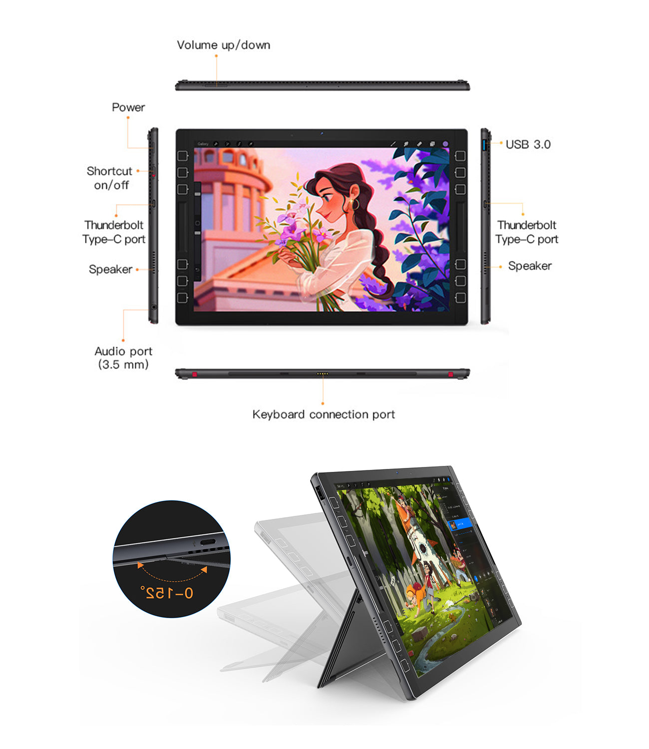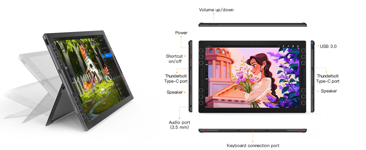 The LincStudio is an all-in-one creator tablet. It comes with an Intel Core i7 processor, Windows 11 OS, a Wacom EMR pen, a 2K display, 12 custom shortcut keys, a detachable keyboard, and a built-in stand.