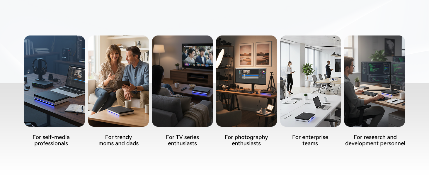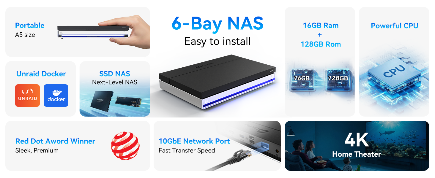 - Flexible 6-Bay Storage – Features 2 SATA bays (2.5" HDD & SSD) and 4 M.2 NVMe slots (2280 SSD) for scalable and high-performance storage options.