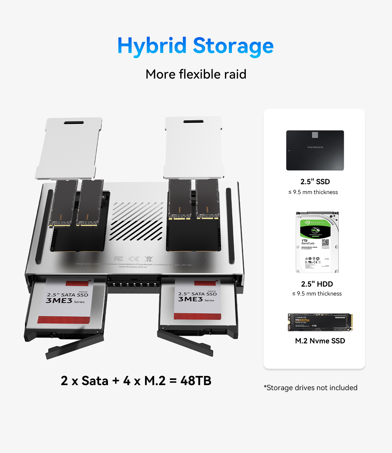 The LincStation N2 supports up to 48TB of total storage, combining ultra-fast NVMe SSDs with high-capacity HDDs or SATA SSDs.