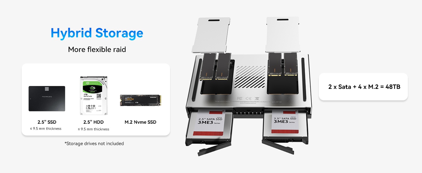 Can use 2.5-inch sata3 interface hdd or ssd, or 2280 specification nvme hard disk. The bay has a height limitation-9.5mm, it can support SATA HDDs that is thiner than 9.5mm.