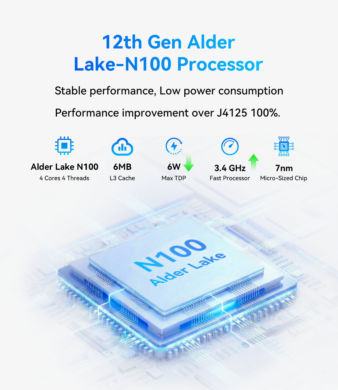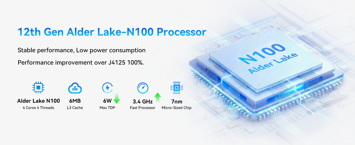 CPU: Intel Alder Lake-N N100, 4 cores 4 threads, up to 3.4 GHz, TDP 6W