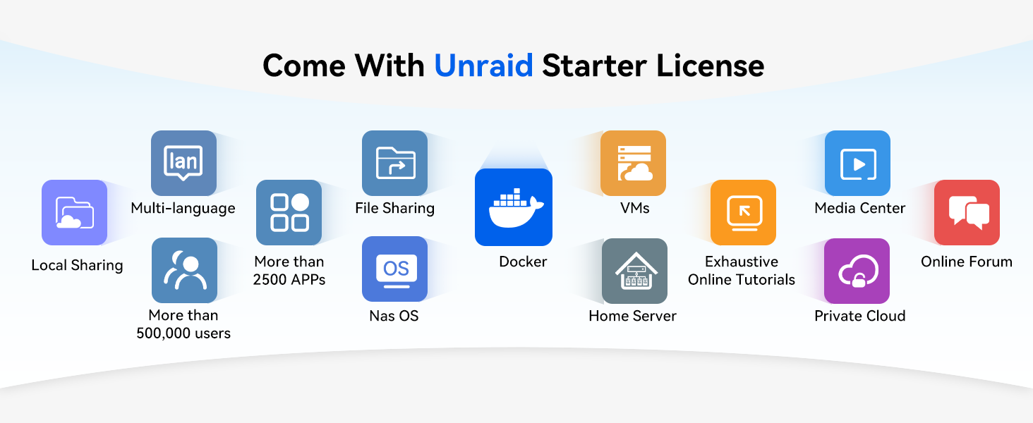 - Unraid OS Included – Comes with a Official Unraid Starter License, allowing you to mix and match different drive sizes and types without RAID restrictions—maximize your storage efficiency.